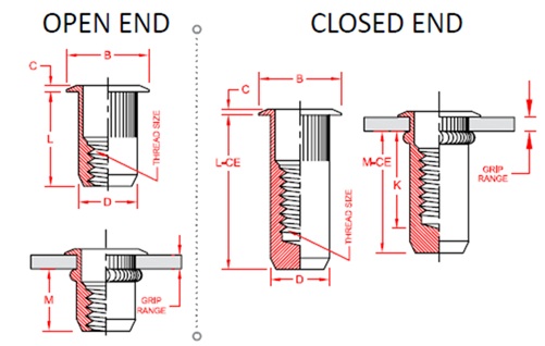 | PART NUMBER | THREAD SIZE | GRIP MIN | GRIP MAX | L-CE (RIVET LENGTH) | B (HEAD DIA) | C (HEAD HEIGHT) | D (BODY DIA MAX) | HOLE SIZE |