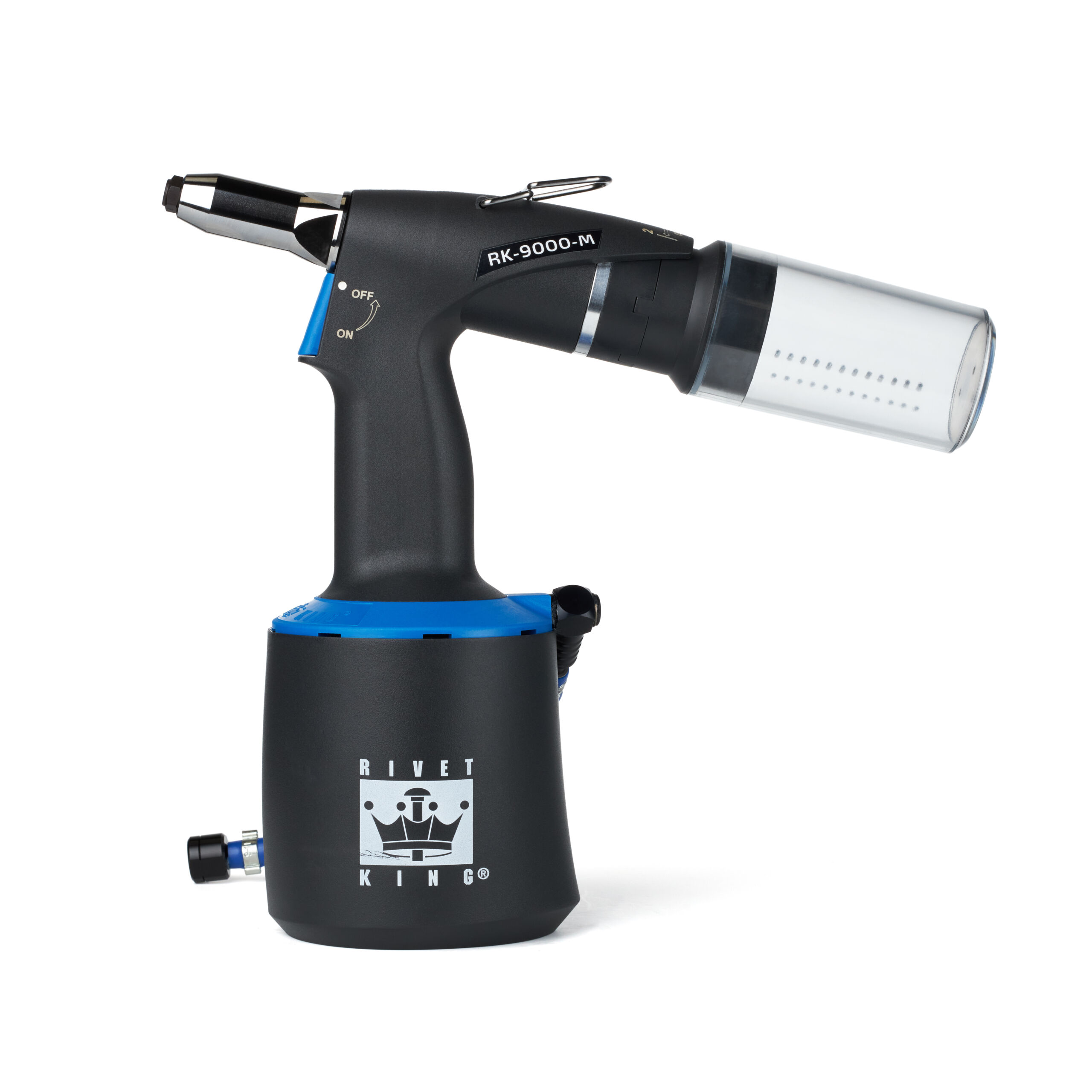 The fusion of power and speed, with an improved ergonomic and rugged design results in a series of tools for the most demanding production environments. The RK-9000 series offers a 360° adjustable air inlet for both left and right handed users. The vacuum force is greatly improved due to its efficient use of air, providing extreme extraction of the mandrel after riveting. The easy touch trigger requires less than .25 lbs force to activate. The rugged, glass filled nylon casing and high durometer rubber boot provides the tool with years of protection. All tools are serialized for tracking. Only care and cleaning is required of the users. Maintenance is supported by service centers nationwide.